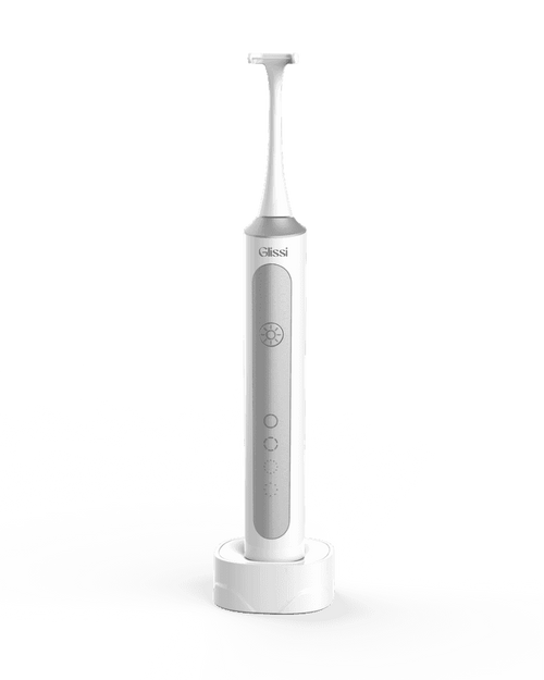 Glissi uses gentle sonic vibrations through a reusable soft floss head that slides between your teeth — just like normal floss — but without the finger wrapping or awkward angles.